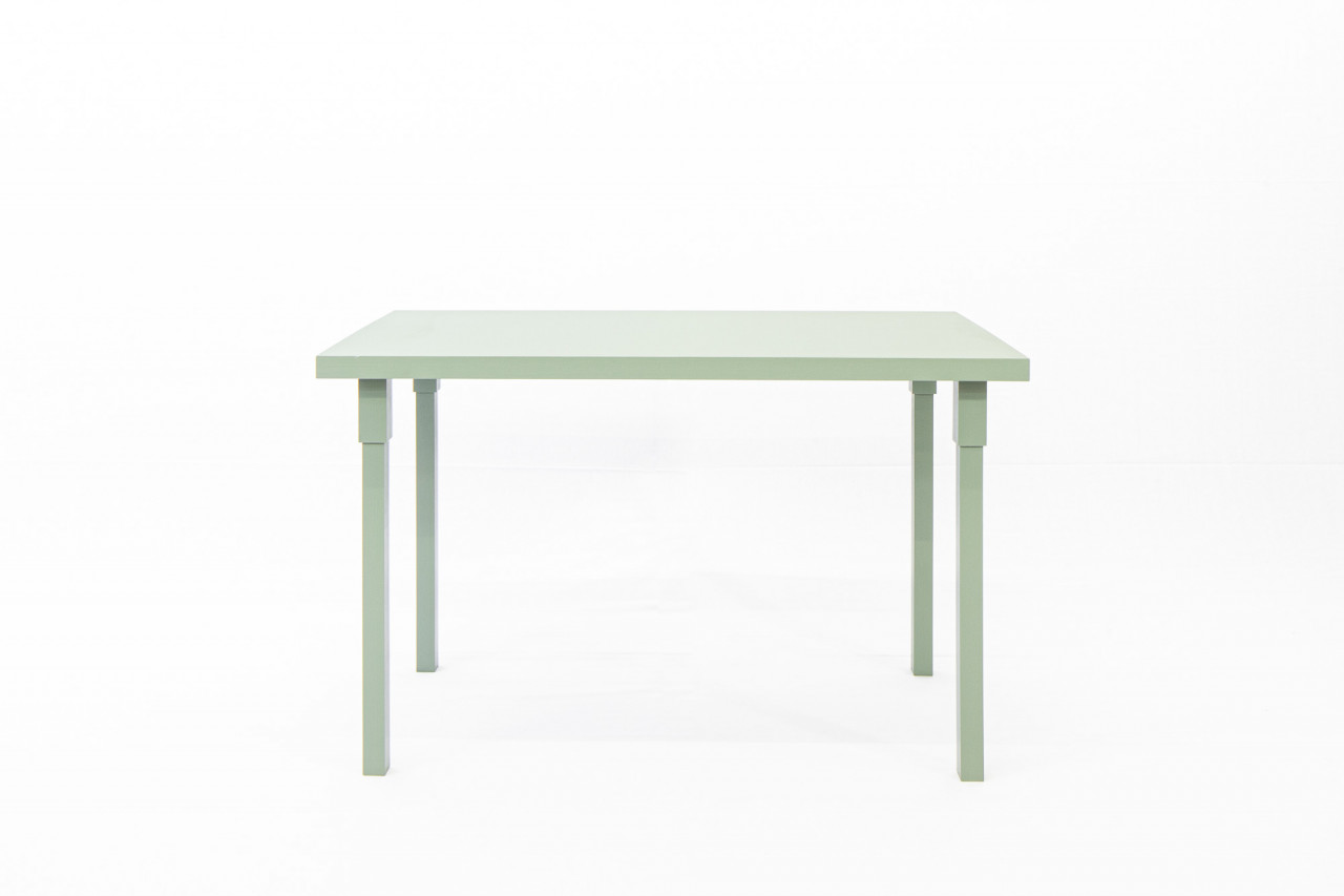 Tischfuss Buche massiv, Oberfläche Tischkante und Tischbein in Linoleumfarbton gestrichen